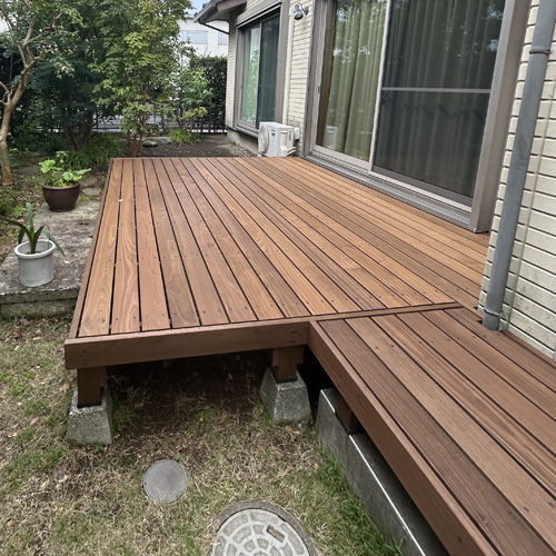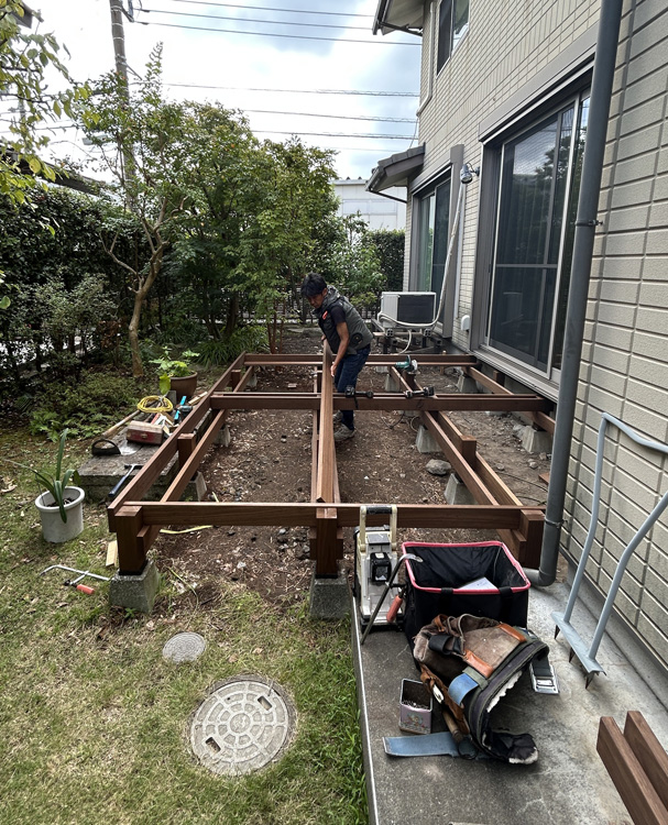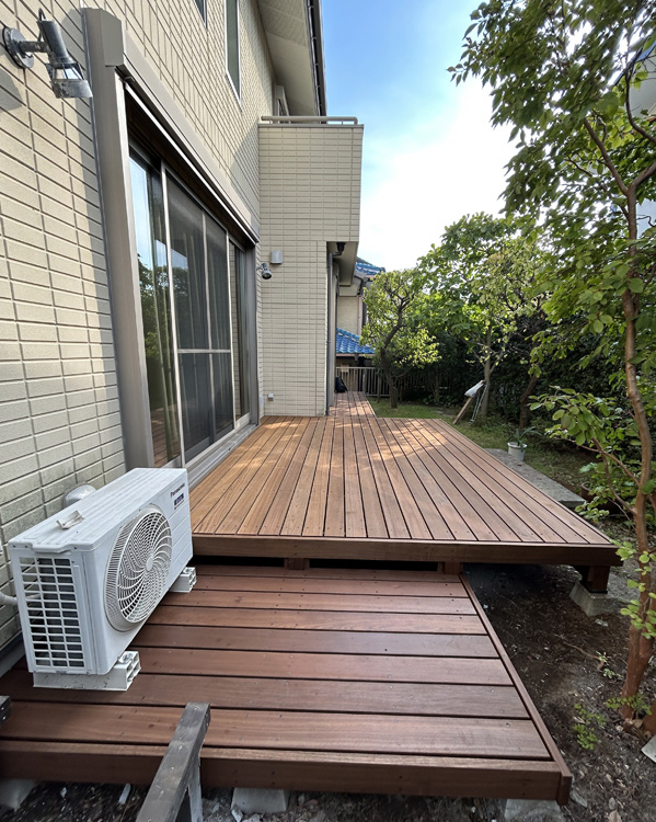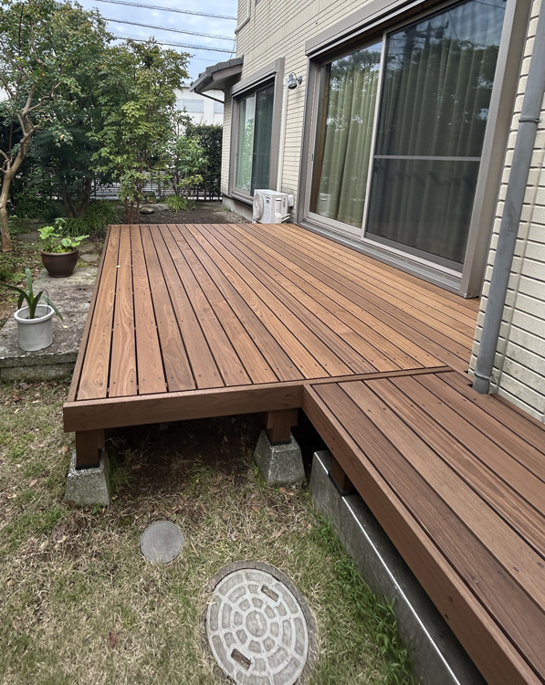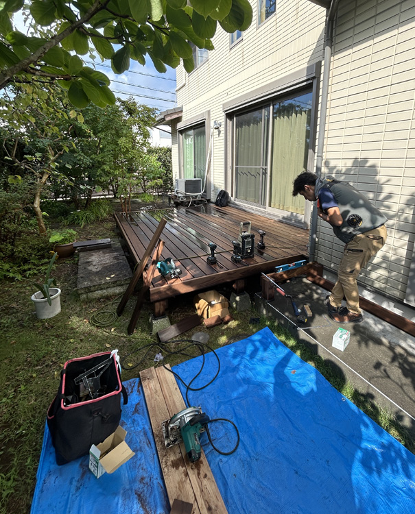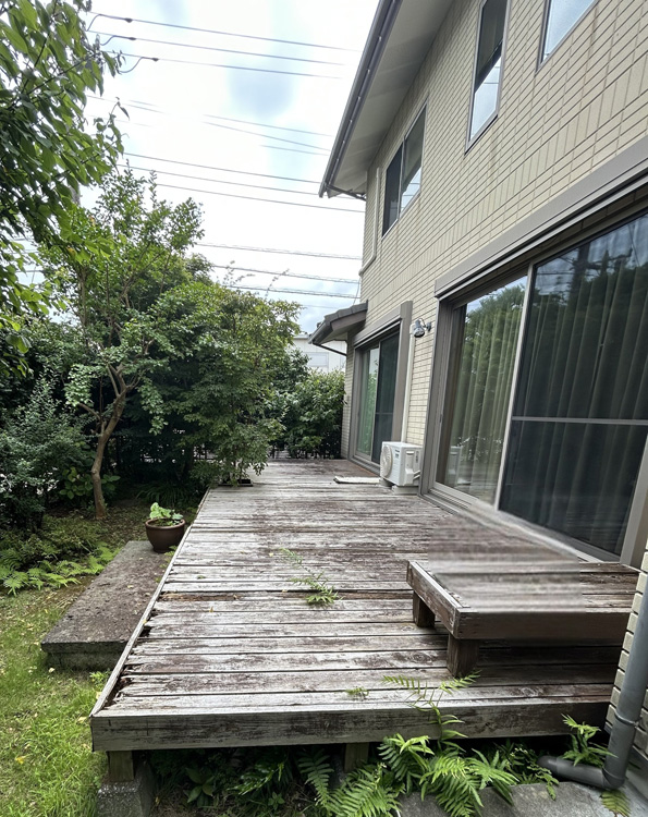 逗子市S様邸にて、老朽化して傷んでいたウッドデッキを新しく造り替える工事を行いました。長年の使用で腐食や変形が進み、安全面でも不安があったため、既存デッキを撤去し、基礎からしっかりとやり直しました。耐久性の高い素材を使用し、弊社社員大工が一枚一枚丁寧に施工したことで、美しく安心して使えるウッドデッキに生まれ変わりました。完成後は「庭で過ごす時間が楽しみになった」とのお声をいただき、ご家族やご友人と快適に過ごせるウッドデッキが完成しました。