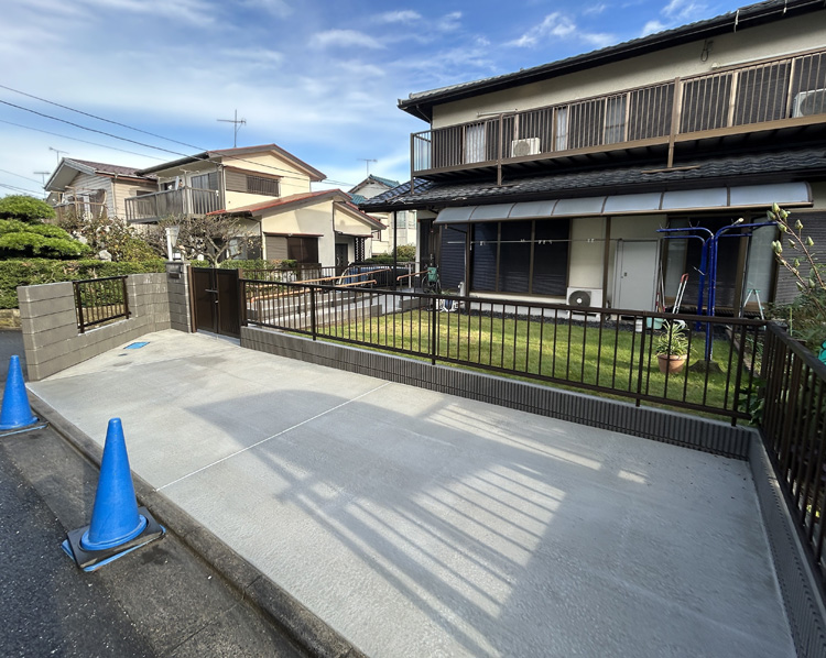 仕上がりの精度とコンクリートの品質にも配慮し、表面も滑らかで見た目にも美しいスロープと駐車スペースが完成しました。完成後は、K様から「玄関まで自分で行けるようになって助かった」とのお言葉をいただきました。