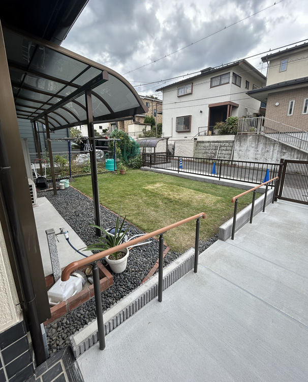 また、お庭の一部を整地して植栽まわりを整理したことで、見た目にもすっきりとした印象に仕上がりました。外構全体が明るく開放的になり、毎日の出入りが安全で快適なものとなりました。今回の施工では、単に段差をなくすだけでなく、生活動線と将来の使い勝手まで考慮した設計と工事を行いました。