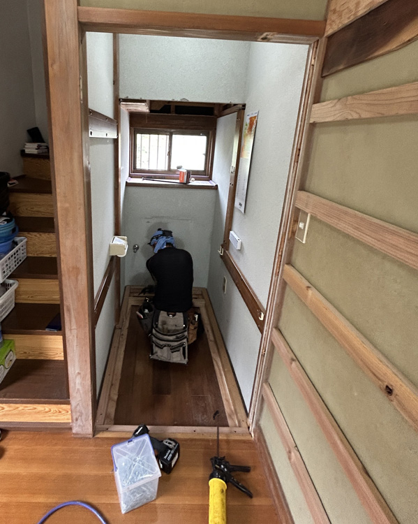 一段低かったトイレは、廊下と同じレベルに床を上げ、それに伴って、天井高を上げる工事も行いました。