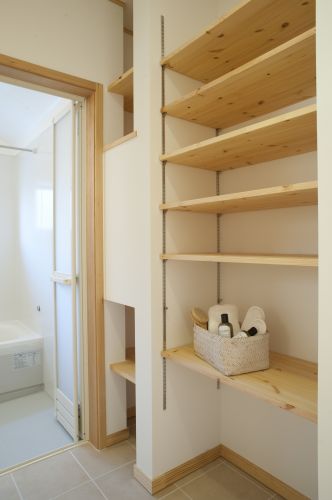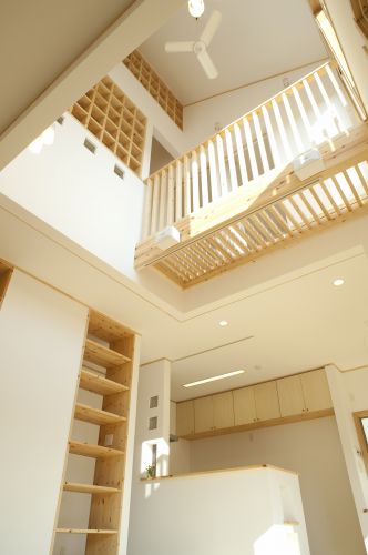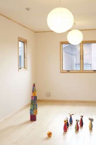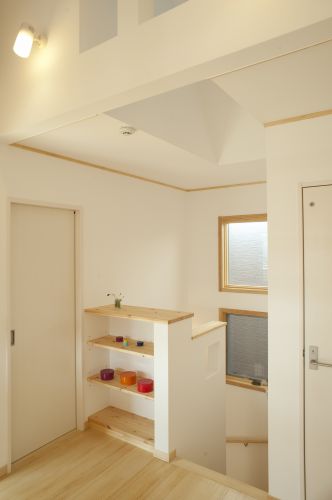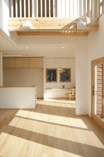 内部はホタテ塗装と無垢のパイン床を使い、ナチュラルなインテリアにまとまりました。木製サッシはクリア色の自然塗料を塗布し素材を生かした仕上がりとなっています。水槽置場、テレビボード、リビングの飾り棚、スタディコーナーの本棚など、随所に東和興産ならではの造作家具が作られ、アイデア満載の収納もそこかしこにあります。これらはパイン板を大工さんが加工して作りました。家づくりに携わるスタッフみんなが‘大きな工夫‘を持ち寄って、良い家を作ろう、使いやすく作ろうと気持を一つに合せて、工事を進めました。