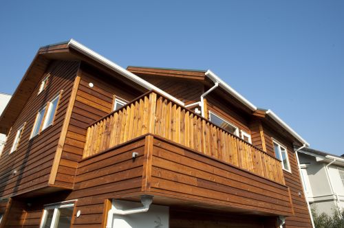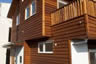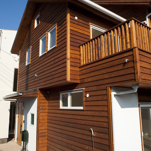 板張りの茶色に、木製サッシの白い枠が映えて逗子にふさわしい住宅の完成です。