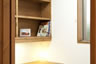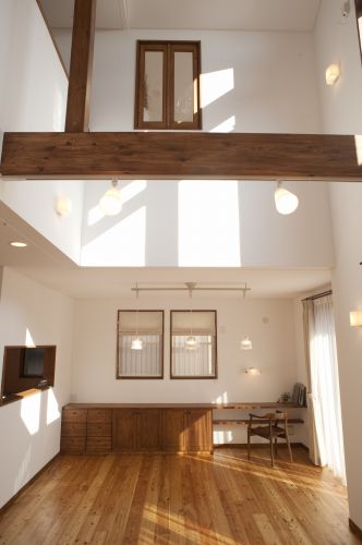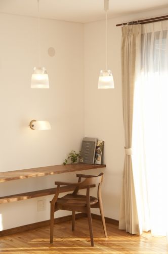 内装はホタテ塗装と無垢のラーチフローリングを使い、ナチュラルなインテリアにまとまりました。玄関の下駄箱、スタディコーナー、書斎、廊下の本棚など、随所に東和興産ならではの造作家具が作られました。