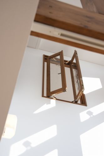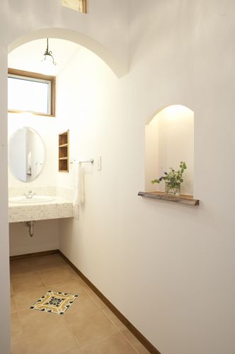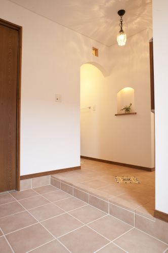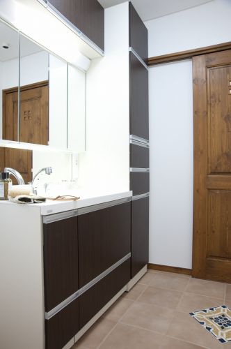 解体前の古家は、お施主さんが幼少の頃によく遊びに訪れた、思い出深い家との事。その懐かしい記憶を新居に繋げたいとの希望を伺い、古家を解体する際に玄関ポーチに使われていたリチャード・ジノリ製のアンティークタイルや、和室の天井を飾っていた桜の梁、すりガラスの照明器具などを丁寧に取りはずしました。倉庫に保管しておいたそれらの材料を、しばしば眺めて考え、工夫して、新居のあちこちに使う事ができました。