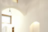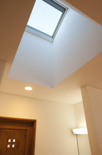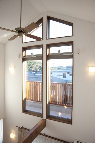 外観の白壁はモルタル左官の上に、遮熱塗料ガイナを吹き付けたもの。ガイナは夏の陽射しで熱を持つ外壁の温度を室内に伝えないという特徴があり、夏の間もエアコンいらずの優れた塗料です。(弊社の事務所内にガイナを塗った壁があり、コンクリート躯体からの熱伝導性能を体験していただけます。ぜひどうぞ!)