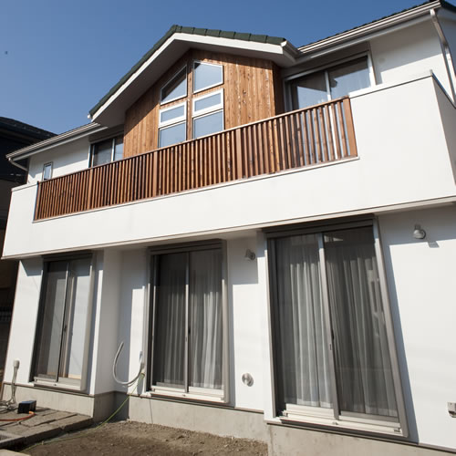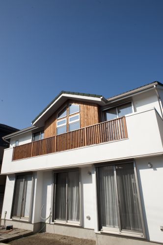 外壁:モルタル+ガイナ塗装、一部レッドシダーパネリング