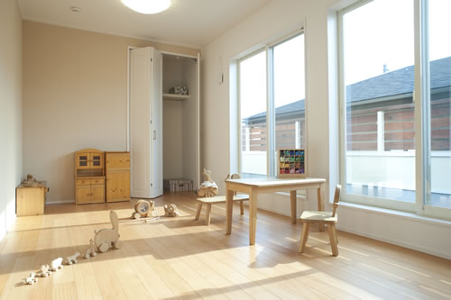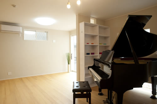 二階にはその寝室と姉妹のための続き部屋の他に、お父さんのための書斎もあり、小さいながらも畳と壁一面の本棚でじっくり読書に浸れそう。ホールの一角には書斎と一体でも使えるパソコンコーナーもあるので家族仲良く暮らせそうです。