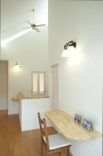 ダイニングの吹抜を見上げるとシーリングファンと寝室からの飾り窓が…。開くと落下防止を兼ねて流木で大工が丹念に作った手摺が見えます。