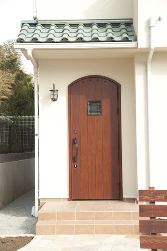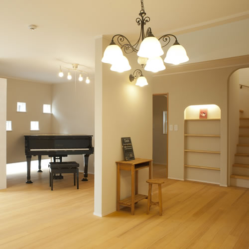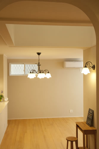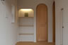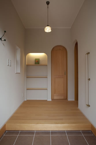 丸い玄関ドアを開け玄関ホールに入ると、丸みのある垂れ壁と飾り棚でつながるトイレも含めて童話のようなエントランスを演出。奥様お手製の可愛い小物がそこかしこに並ぶ予定です。