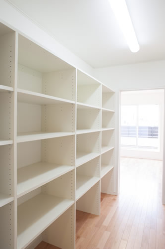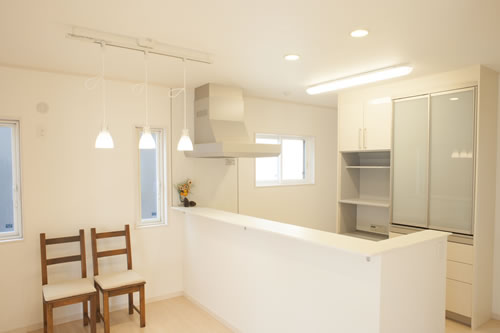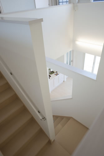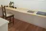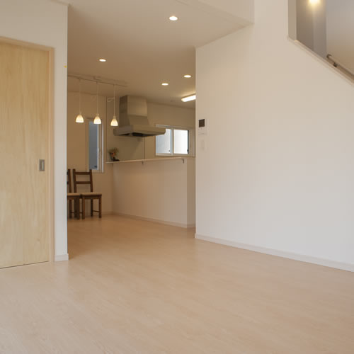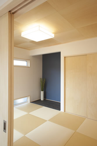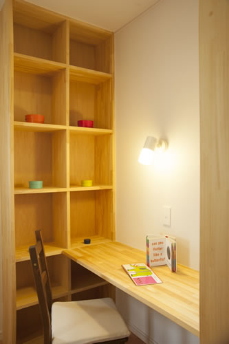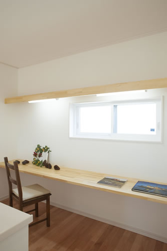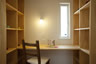 木更津に立つ45坪の大きいお家です。SRC基礎を採用しているので家の中心に位置する階段と大きな吹抜を通して2階へも暖かい空気が上がります。その吹抜をぐるっと一周回れる2階ホールには家族全員が並んで本を読める長いカウンターを設置しました。 広いLDKには和室も隣接。和紙畳に土佐和紙の壁紙、天井は板を市松柄に貼っています。 左右に本棚が配置された書斎は一番落ち着くスペースです。