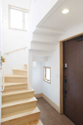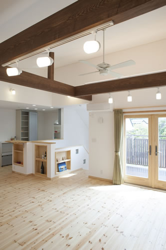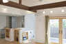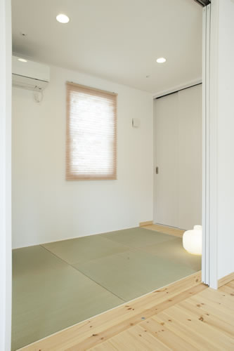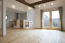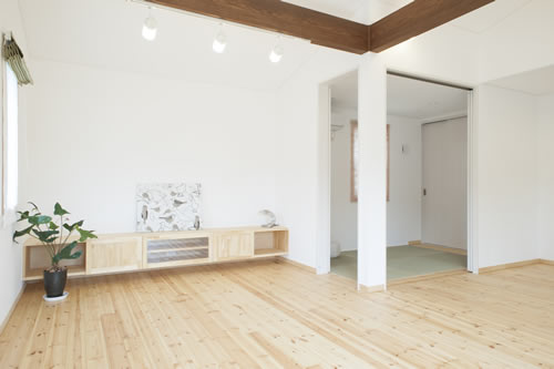 室内もホタテの貝殻を使用した塗り壁で真っ白に仕上がっている中、アクセントとなる窓は全て輸入サッシのアンダーセンを採用しているため、節のあるパイン無垢フローリングと併せて、木質感のある窓枠がナチュラルな雰囲気を演出しています。大工造作のTV台や食品庫、畳コーナーもあり、30坪の中に工夫が詰め込まれています。