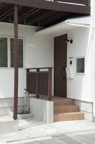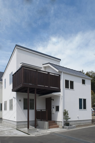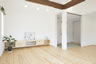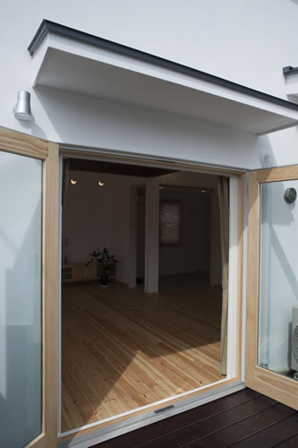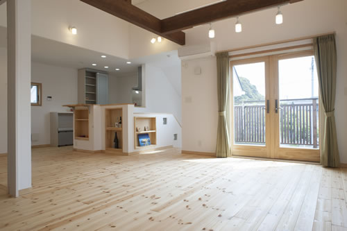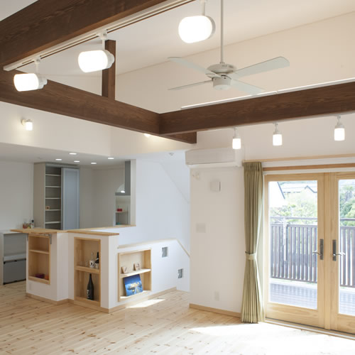 逗子の完成な住宅街に建つ真っ白な家。化粧梁のある大きな吹抜けをそなえた2階リビングから、大きな両開きの窓でウッドデッキへつながります。