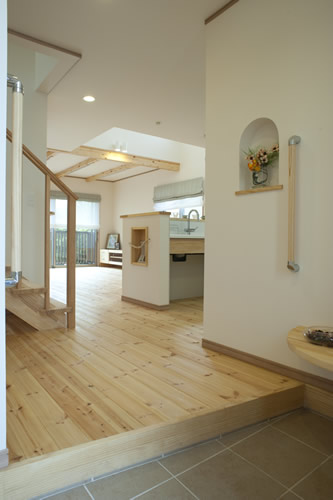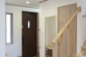 玄関を開けるとストリップ階段の手摺子が見え、無垢面材のキッチンに無垢のフローリング、化粧梁も有り、いたる処にナチュラルで暖かい木目が見えます。