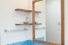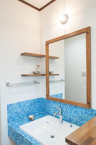 一枚立ち上がっている白壁に、ドアと青タイルのポーチを付けた地中海風ファサードのこちらの家は、三浦半島の西海岸、佐島にある「なぎさの丘」の一角にあります。
