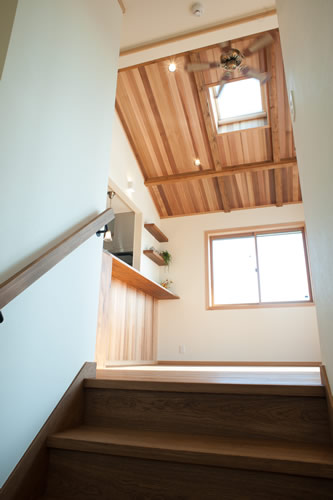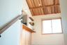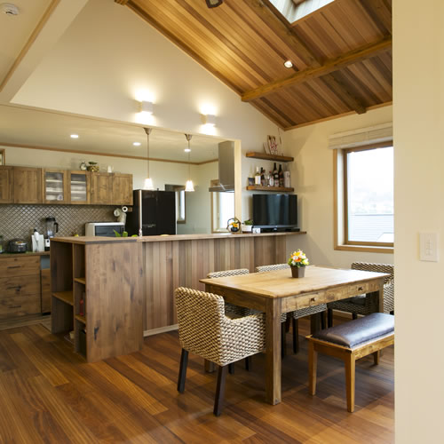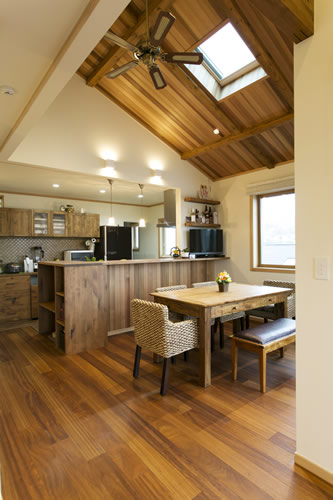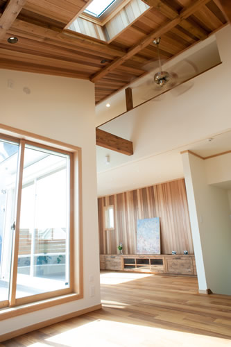 天窓のある勾配天井はレッドシダーの板貼で仕上げ、リビングの壁にも板貼でアクセントを付けて別荘のような空間に計画しました。