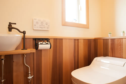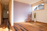 1階はアンティーク加工したボルドーパインにドアも無垢材を使用し、寝室の掃出し窓には南向きのレッドシダー材のウッドデッキも設置。