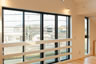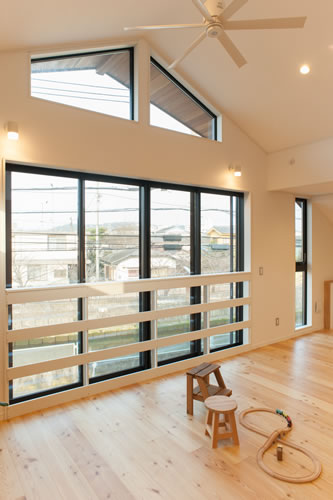 2階へ上がりLDKを振り返ると川に面した幅3.4m高さ2.4mの両引き分け窓が。特注サイズのフルオープン開口は圧巻です。天井の高いリビングから和室へ続く引き戸は黒板塗料で仕上げているので、これから描かれる子供達の絵がアクセントになる予定です