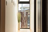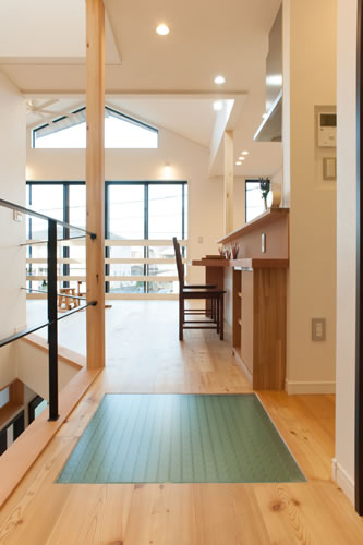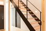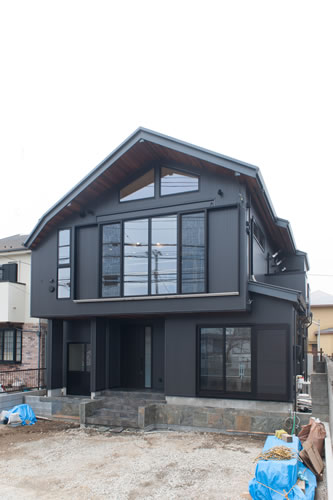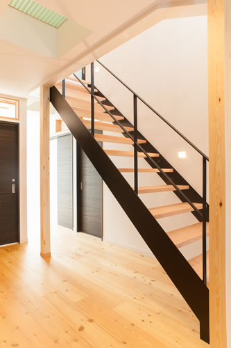 駅近くに建つ延床50坪弱のこちらの黒い家は、玄関を開けると目の前に広いホールと真っ直ぐに上へ伸びる黒い鉄骨スリット階段を設置。上部にある天窓からの光も差し込み、とても明るい空間になっています。ホールから続く1階各部屋は全てのドア上部に欄間を造作して、子供部屋や寝室へも風と光が通るように配慮しました。