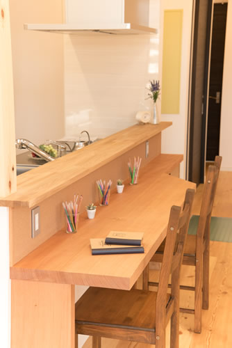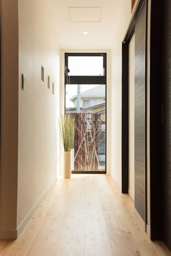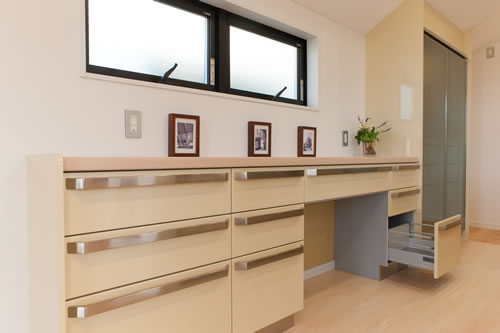 当初の希望から、建物に付属した外物置や通り抜けの出来るシューズクローク、ご夫婦各々のウォークインクローゼットに洗濯用の納戸など、荷物を出さずにすっきり暮らすための収納も沢山用意されており、収納する物に合わせて各所に特殊セラミックのガイナや、天然の粘土鉱物モイス等を使いながら湿気対策をしています。