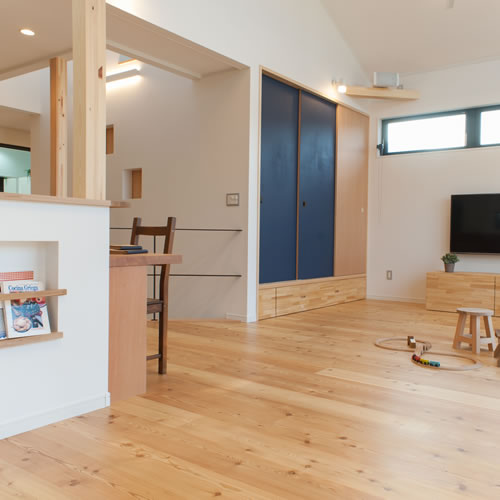 来客用の小上がりの和室内部は奥様の選ばれた薄いピンクの畳に加えて、天井の板張りや地窓の障子、階段を見下ろせる室内窓など、おもてなしのために少し雰囲気を変えました。
