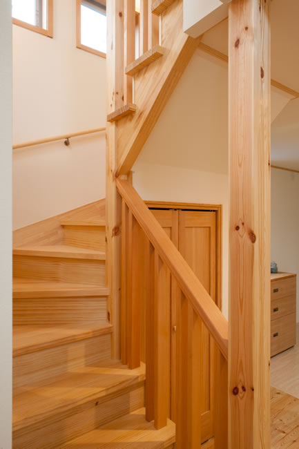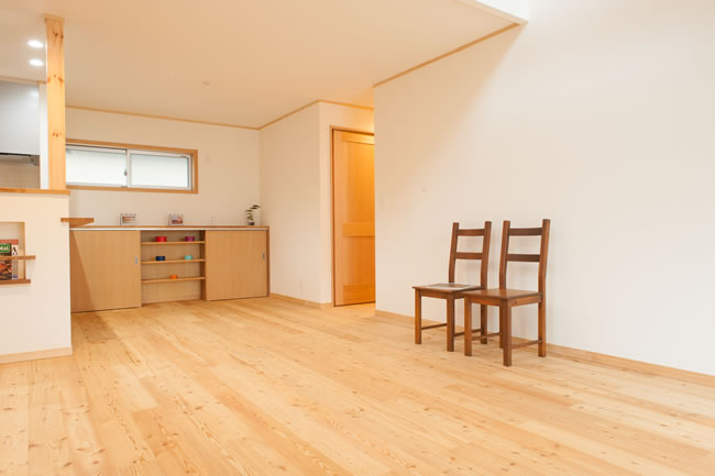 実は南東側の採光で暖を取る事が難しいこちらの立地、リビングは大きな吹抜で西側からの明るさを確保しつつ、蓄熱式床暖房基礎を採用して高い天井までふんわりした温かい空気で全体を保温する魔法瓶のような空間に仕上がりました。