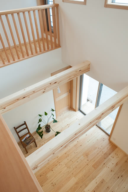 吹抜に面したキャットウォーク状の2階廊下は天井のレッドシダー板張りと相まって整然と並んだ手摺子が圧巻です。外観も真っ白な壁と明るいポーチタイルで、北玄関でも明るい印象になっています。