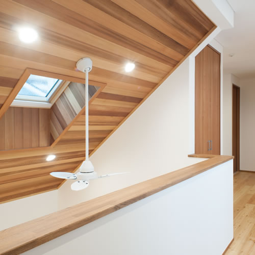 1階軒裏、リビング天井板貼;レッドシダー