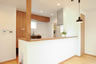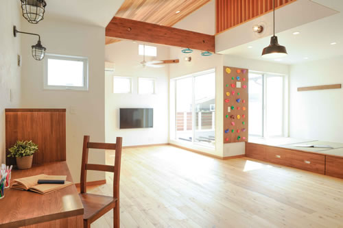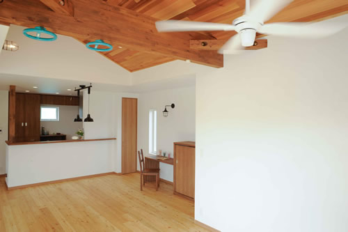 2階LDKは高い勾配天井で広めに吹抜を取り、一角に小上がりの畳コーナーを配置した設計となっており、固定階段で上がるロフトからはリビングと外を流れる川の両方を見下ろせます。