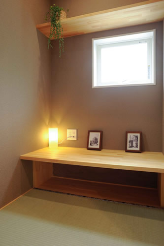 社員大工が造作したダイニングボードやキッチンバックセット、畳下引出等は全て濃いめの色に塗装して、レッドシダー天井板と合わせて落ち着いた雰囲気に仕上がっています。