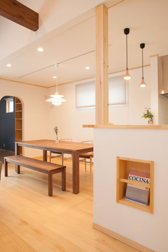 2階リビングの白い壁に丸窓を見上げるこちらの家、壁一面の壁面収納に、床の色、勾配天井のレッドシダー板貼、少し濃い目に塗装した化粧梁、隣接したバルコニーの横桟手摺と、いくつかの木の色が見えるのですが、雰囲気良く調和しています。