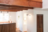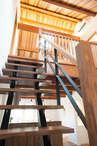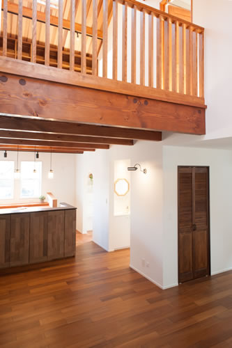 木製玄関やアメリカから取り寄せた水栓器具など等、細部までお客様のこだわりと職人の技術が行き届いたとても贅沢な作りになっており、特に、リビングから上を見上げると、1階と2階で素材を変えた天井の板貼りが一度に見えて圧巻です。