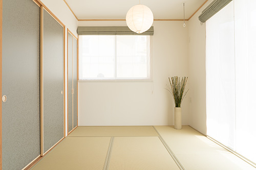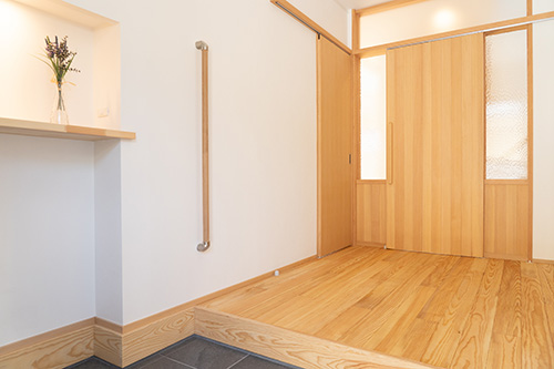 玄関を開けるとまず、広いシューズインクロークと手洗いのあるホール、LDKに続く米松材で造った明かり窓付の引き戸に迎えられます。