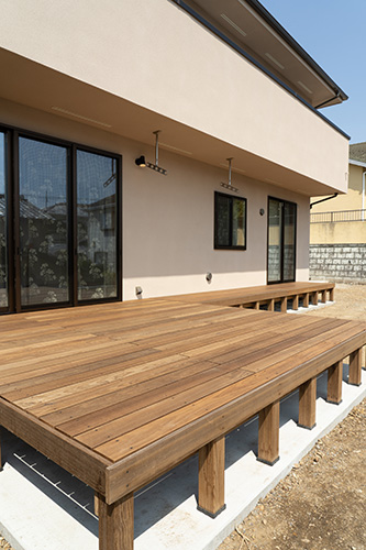 リビングの続きに広いウッドデッキを造ることで、中と外を一体に感じられる心地良いリビング空間に仕上がっています。
