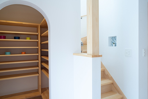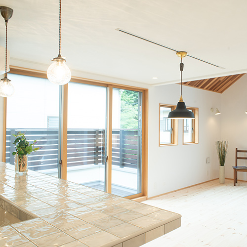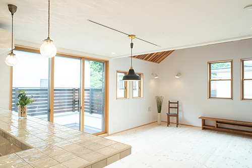内装は無垢のパインフローリングや無垢パイン材の造作家具で統一し、奥様がこだわってセレクトした雰囲気のある照明や クロス 等を 引き立てられる様に し てい ます。
