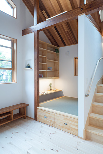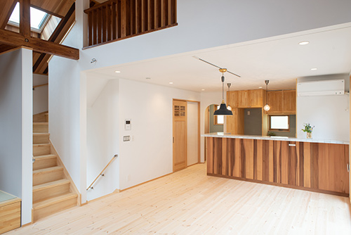 またLDK の吹き抜けのレッドシダー板張り天井からは木の香り も香る、木を存分に感じられる家になっています。