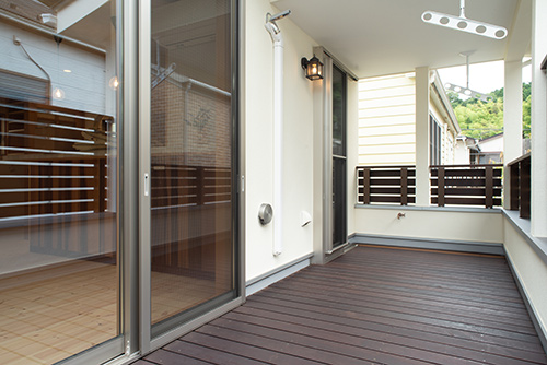 可愛い三角屋根のソフトホワイト色の 外観 とバルコニーのウッドフェンス が迎えてくれるお家です。2階に LDK と書斎を兼ねた小上がりの和室、水廻りがあるので、生活のほとんどが 2 階で済む間取りになっています。リビングから続くロフトも階段で上がれる様にし、子供たちにとってお気に入りの遊び場になりそうです。