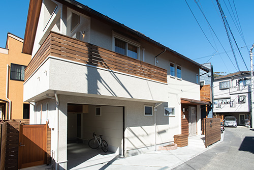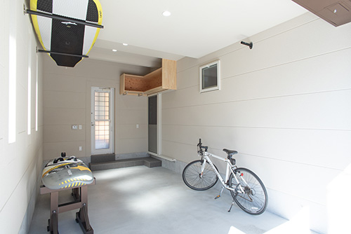 「家族の海遊び道具等がたくさんある」という事でビルトインガレージを造り、そこから直接洗面・浴室に行ける動線にしました。床は赤松の無垢フローリング、それに合わせて造作家具本体も赤松を使用、ダイニングの吹抜勾配天井はレッドシダー板張と、木を存分に感じられるお家です。