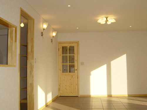 床:1階はすべてタイル貼。2階はウッドワンのカラーフローリング。 壁・天井:ビニールクロス 建具: Bioパインドア キッチン:クリナップ クリンレディシリーズ ユニットバス:ノーリツ Rizシリーズ