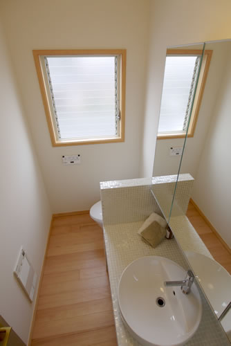 トイレも、洗面台をタイル貼りにして南欧風に。広々としたトイレと洗面台でリラックスできる空間になりました。