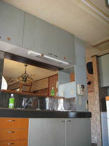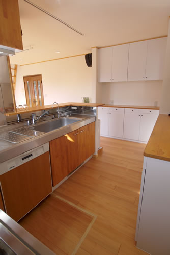 リビングダイニングからよく見えるカウンターキッチンは、元々しっかりとしたキッチンが使われていたので、イメージを統一するために化粧直し。扉にパインのキッチン扉を使用し、ミレーの食洗機を入れました。