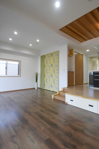 LDKを広く見せるために、まずキッチンとダイニングの間の壁を撤去し、吊戸を吊棚に変更、ダイニングとリビングの間の手すりも撤去して床をすべて張り替えました。