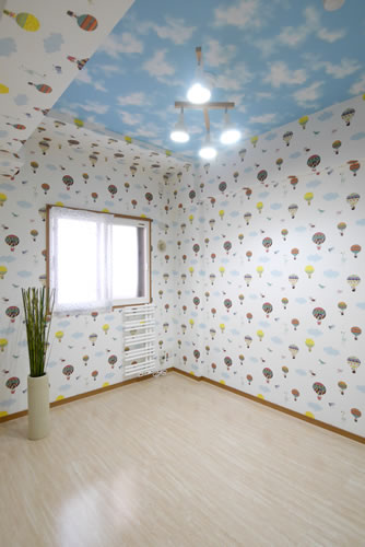 お孫さんのために用意した部屋にはポップな壁紙と壁付けのタオルウォーマーを設置しています。