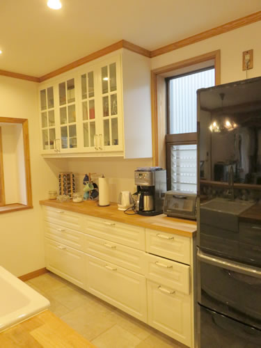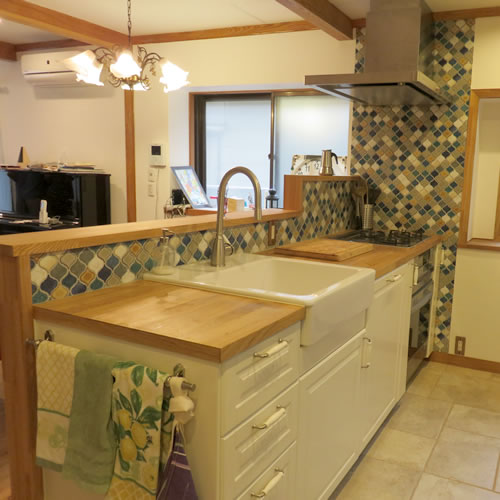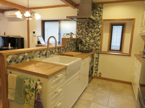 またキッチンは別途キッチン工事手配されたものですが、もともと壁付だったものを全て撤去の上、腰壁を弊社で作成、名古屋モザイクのコラベルタイルや出窓カウンターも合わせて仕上げています。