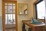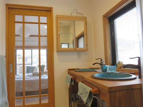 つながった元書斎のミニキッチンを撤去し思い切って2ボウルの洗面台とガラス張りのシャワーブースを造ってホテルのような寝室専用バスルームにしました。