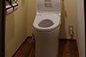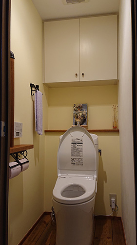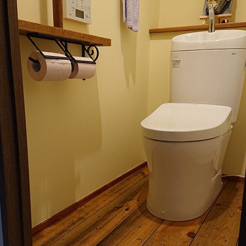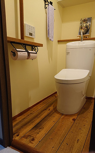 マンションにお住まいの方からトイレのリフォーム工事をご依頼いただきました。管理組合から、マンションの構造上トイレの床下に水道管・ガス管等が通っているため「トイレ交換をする際にはビスが既存床に貫通しない様、床上げをするように。」という指導があり、床上げをするのであれば折角なので無垢フローリングを使うことに。