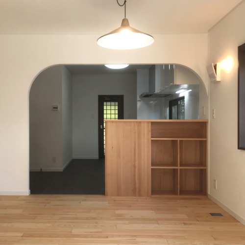 2階建ての広いお家ですが、今回のリフォームは予算を鑑みて、玄関ドアの交換、1階LDKの内装替えとキッチン・浴室・トイレの設備交換のみを行うことになりました。キッチンとダイニングの境の壁をRにしたり、カウンター収納をお施主様の持ち物に合わせて造作したりといった工夫もしています。何より水廻り以外の空間に無垢フローリングをセレクトして頂いたので、裸足で歩いても心地良い、気持ちいい空間に仕上がりました。