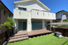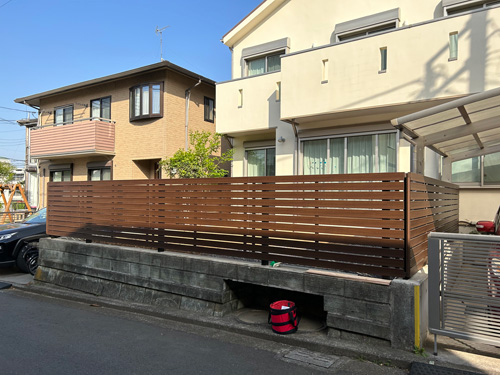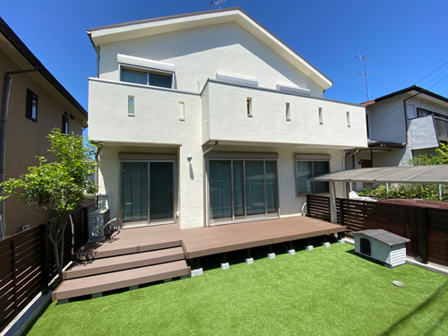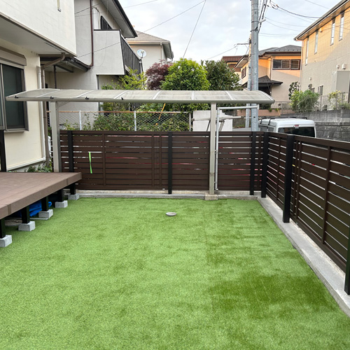 お庭全体に作られていたウッドデッキ、ウッドフェンス。「メンテナンスが大変に思えてきた」ということで、取り壊し新たに木調のアルミフェンスを新設。庭には防草シートを敷き詰め人工芝を貼り、YKKリウッドデッキで仕上げました。