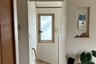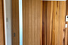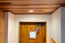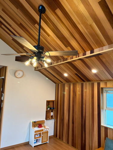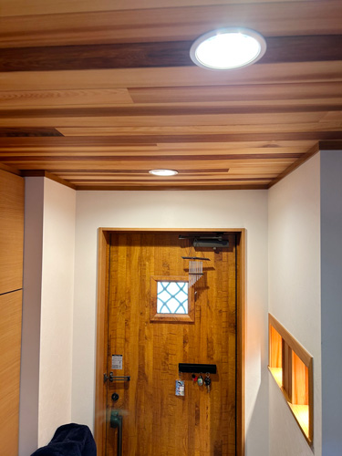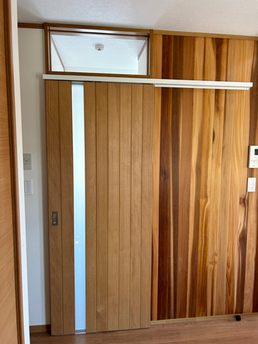 玄関周りもメンテナンスのしやすい範囲のみアクセントとして、壁は飫肥杉(オビスギ)・天井はレッドシダーの無垢板を貼って仕上げました。更に冷暖房の効率を改善すべく、2階リビングの入口に木製のアウトセット引戸を新設しました。たったこれだけの変化ですが、グッとお家に重厚感が加わったように感じます。