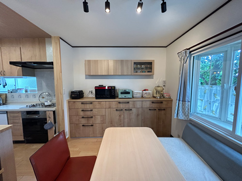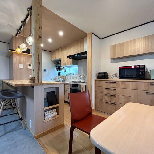キッチンのカウンター収納は奥様がご自身の使いやすさを考えて棚の高さや引き出しの配置を工夫。ダイニングの壁面収納は、お洒落なお気に入りの家電を横一列に並べられるように、H様支給の家具を設置。その上にも壁付け収納を製作し上下セパレートのデザインに。