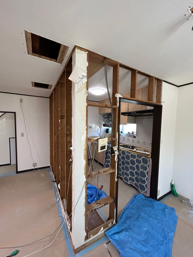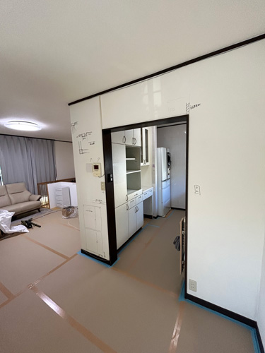 親御さんから受け継いだ築37年の戸建て。当時、流行りだったであろう独立キッチンを、開放感があってリビングやダイニングと一体感がでる対面カウンターキッチンに変更し、更にダイニングの壁面には、H様お気に入りの収納家具を取り付けたいというご要望がありました。